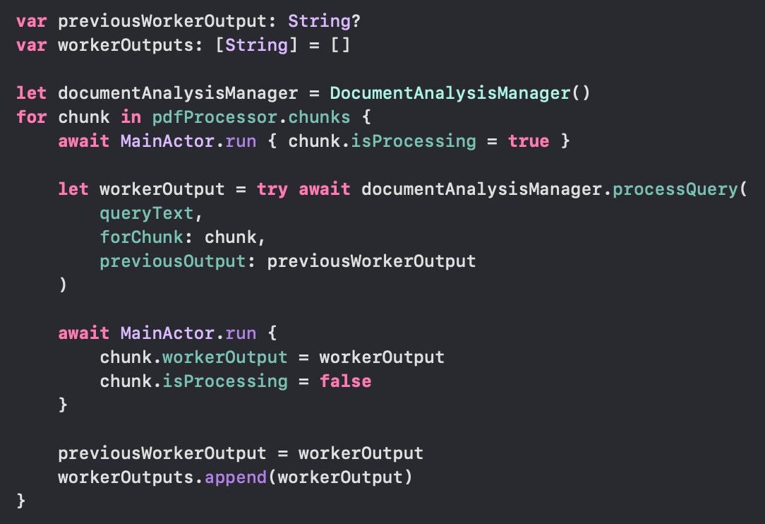 To showcase this concept, I developed a simple Mac app that lets users upload a PDF and ask any question about its contents. For demonstration purposes, the app displays each individual chunk along with its corresponding output, as well as the final answer.