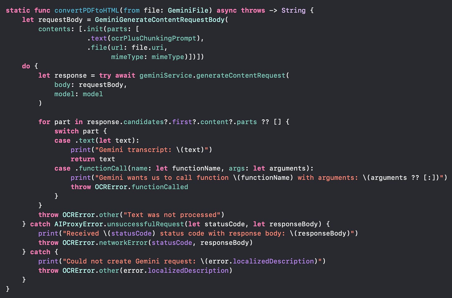 Next, prompt the Gemini model to return the document in your desired text format. For my use case, I chose HTML because it’s easy to display in a Swift app and preserves the original formatting. I also configured the model to chunk the document by wrapping each section in <chunk></chunk> tags, making it simple to parse later. I used the following prompt: