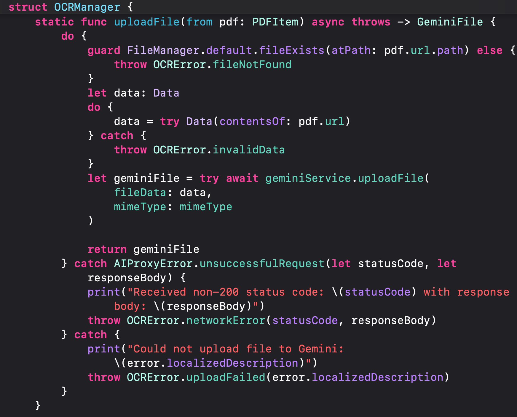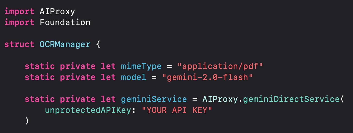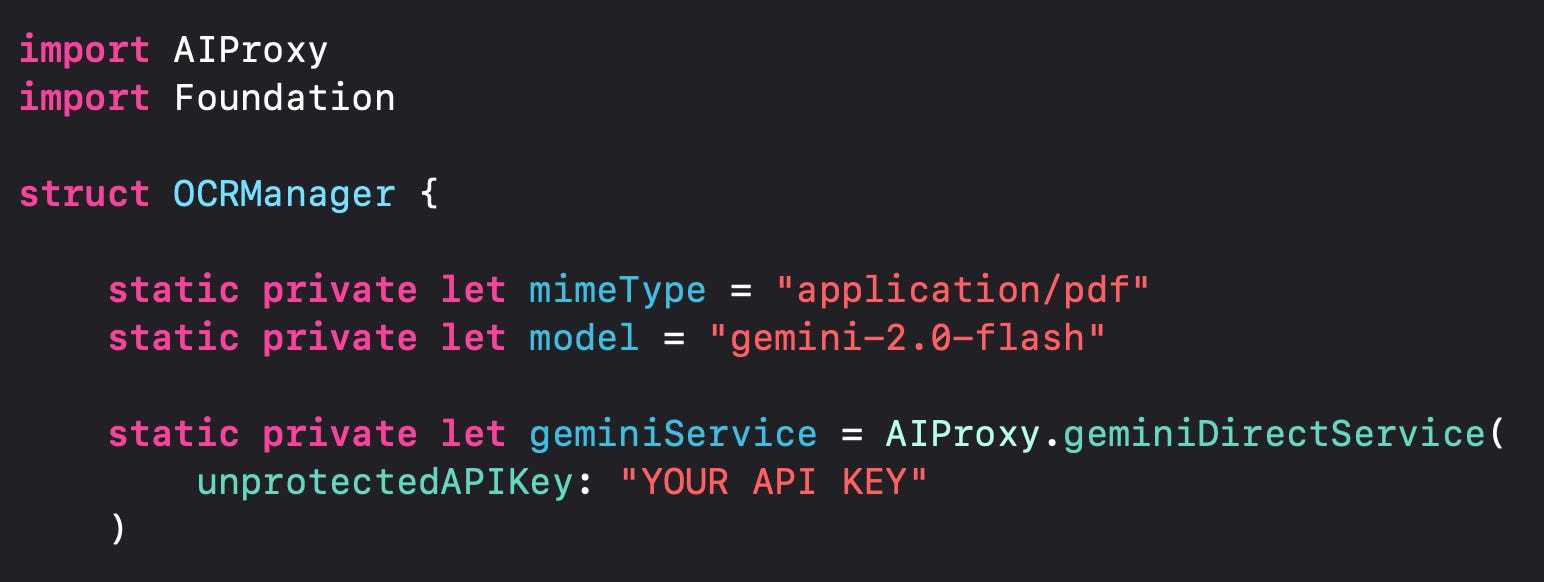 To work with PDF documents in Gemini, the first step is to upload your document. Using the AIProxySwift library makes this process straightforward.