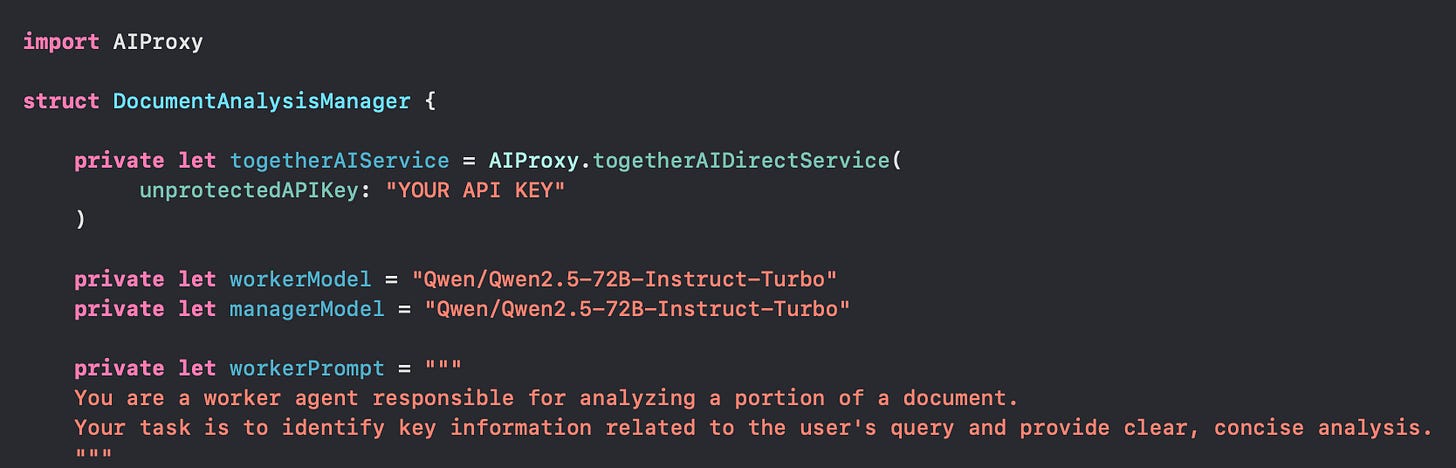 Note that in this code sample, I’ll be using the AIProxy AIProxySwift library. This library is good for two purposes - it securely stores your AI service API keys on the server to protect them from hackers. And it provides SDKs for many AI services, making it easy to work across models as needed.