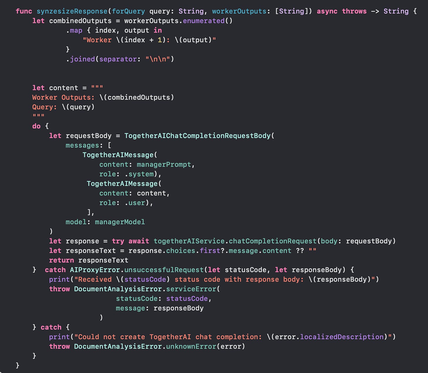 For the Manager Model, I selected the Qwen/Qwen2.5-72B-Instruct-Turbo model—identical to the one used for the Worker Model. However, the optimal choice depends on your app’s unique requirements, so experimenting with different models is key to achieving the best synthesized response. In some cases, using distinct models for the Worker and Manager roles might be beneficial. For instance, you might explore a reasoning model like DeepSeek R1 for analyzing complex queries in the chunks.