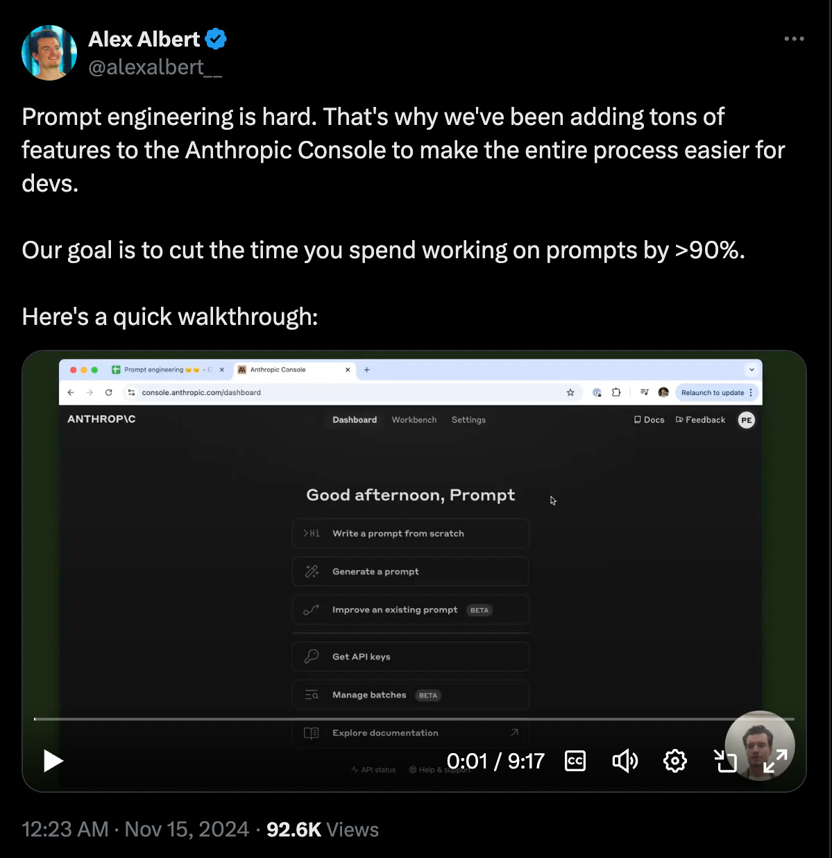 This is why I was excited to see this Tweet and video from Head of Claude Relations @alexalbert__. In addition to Anthropic’s amazing interactive Prompt Engineering spreadsheet, they have created a tool in the Anthropic Console to easily test out different prompts. Check out the video of how to use it in this tweet.