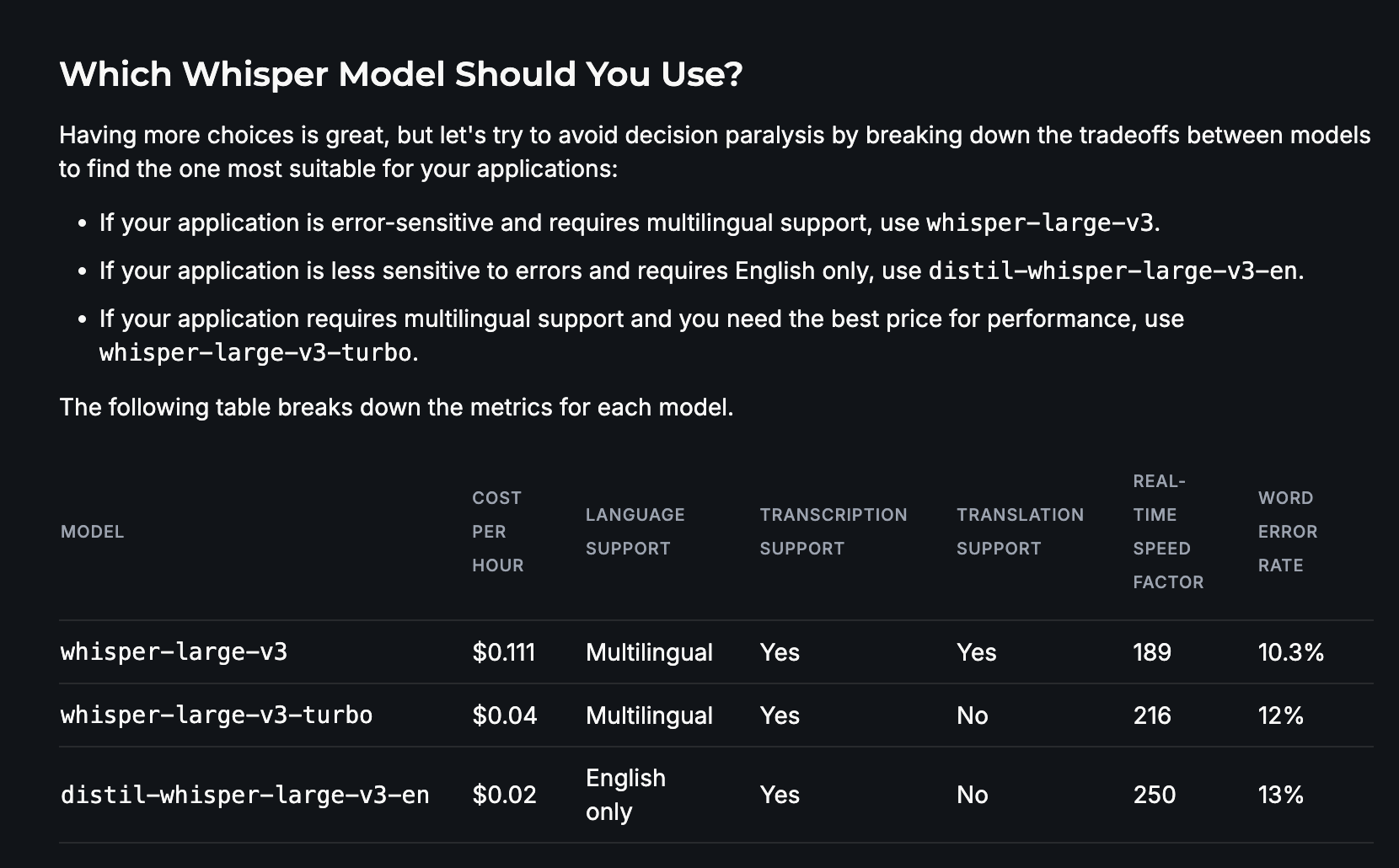 Since OpenAI created the Whisper model, they have a great API for it, which many open source libraries integrate. However, the pricing is high at $0.006 / minute, which adds up to $0.36 / hour of recording. Instead, I will be using the Whisper model hosted by Groq, a company that provides APIs for many open source models, at the cost of $0.111 / hour of recording: