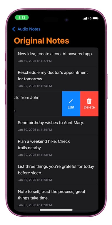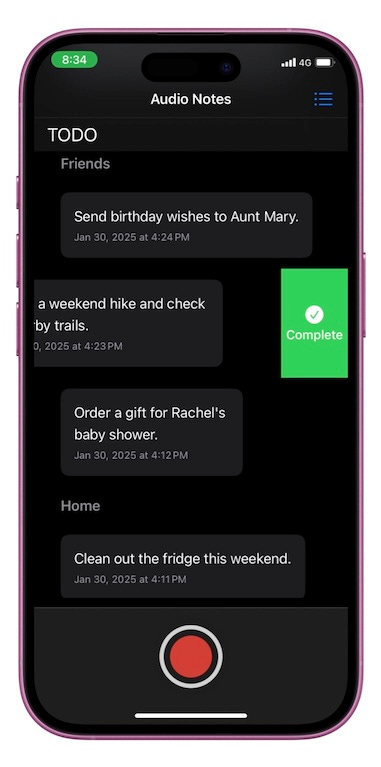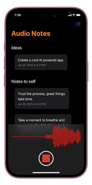 The harder part is processing the transcription. In the case of the Audio Notes app, the Note object is stored in Swift Data, with the transcribed text and the original audio recording is deleted.