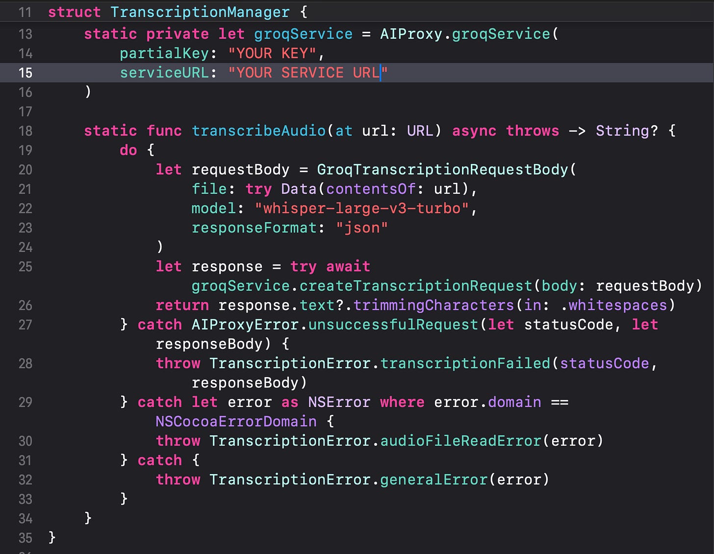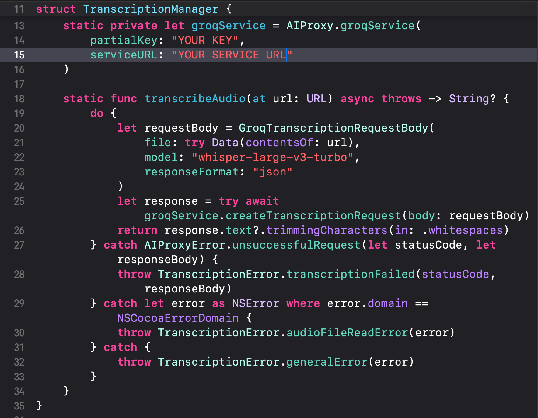 To integrate these APIs, the difficult part for client-side developers who do not want to manage a backend is storing the API keys securely. For this purpose, I’ll be using AIProxy, which makes it very easy to store and manage API keys with checks such as rate limits, DeviceCheck, and specifying endpoints to make sure hackers do not steal and misuse these expensive services. AIProxy also provides the AIProxySwift library to easily integrate with multiple AI service providers, including Groq and OpenAI.