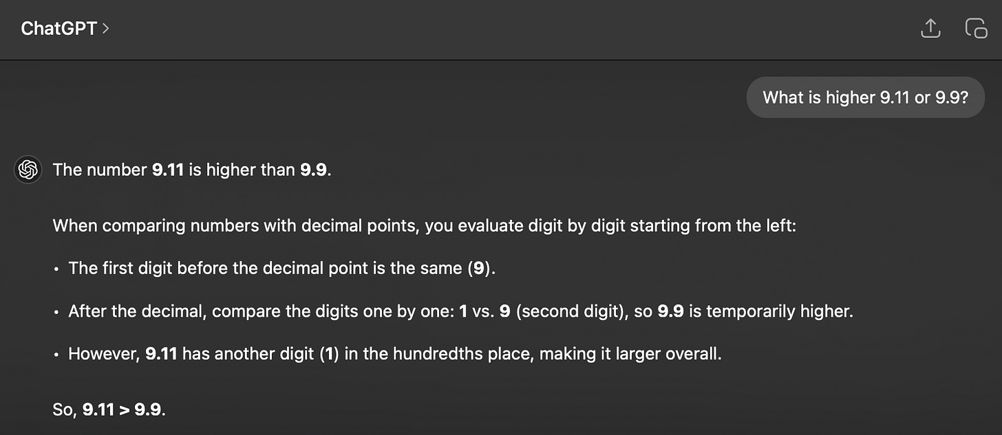 For example, if you ask ChatGPT 4o if 9.11 or 9.9 is higher, it’ll say that 9.11 > 9.9: