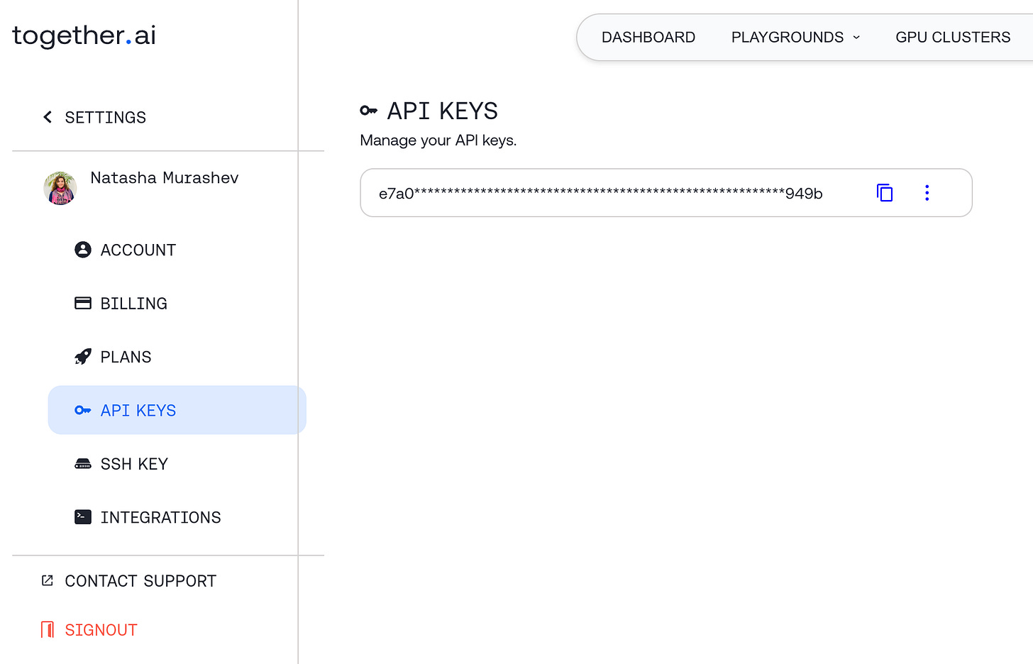 The first step is to sign up for Together.ai and add a bit of money to the account - under $5 is fine for testing purposes. When you go to your account settings, you will see your API Key:
