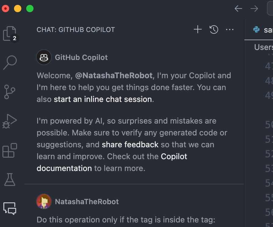And the good news - VSCode supports the GitHub Copilot chat assistant right in the IDE! Just click the chat-box icon on the left at any time and type in your question! The Chat has complete access to the document you’re working on, so you don’t have to paste your code like you do in ChatGPT every time. It gives you very personalized code suggestions right there in your IDE!