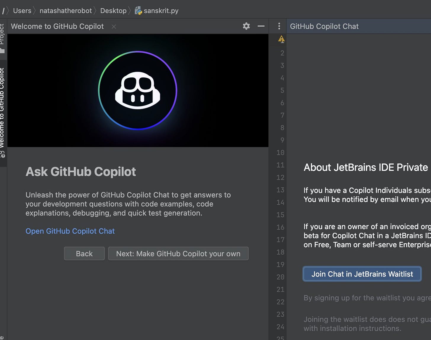 Since I’m now working with Python, I chose PyCharm… This led me to a page where I ended up paying a monthly subscription just to test it out. Unfortunately, JetBrains does not yet support the GitHub Copilot AI chatbot: