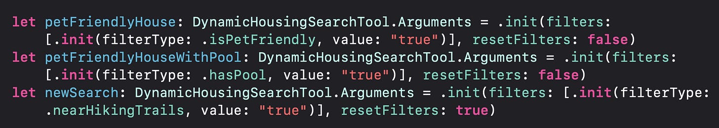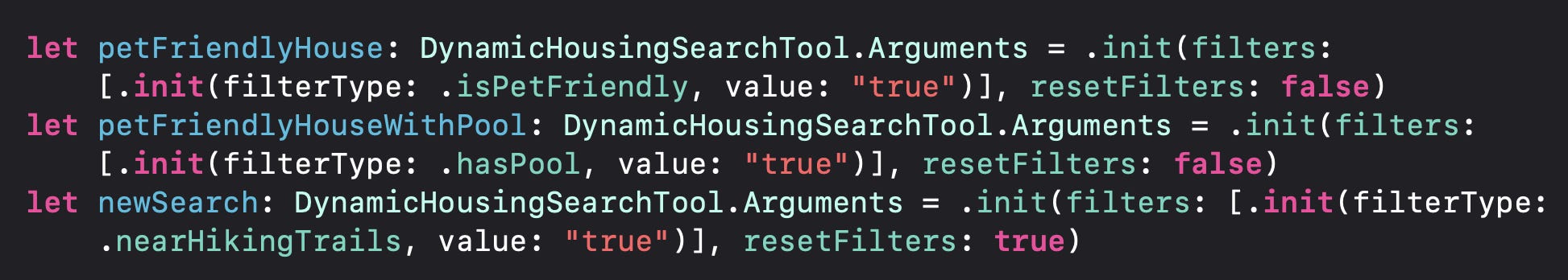 Since you’re controlling the end-to-end UI of this application, instead of passing the house results to the language model to display to the user, you can use the Tool call to trigger a UI update to directly DISPLAY the results to the user while sending the response to the model as a message simply saying you applied the requested filters.