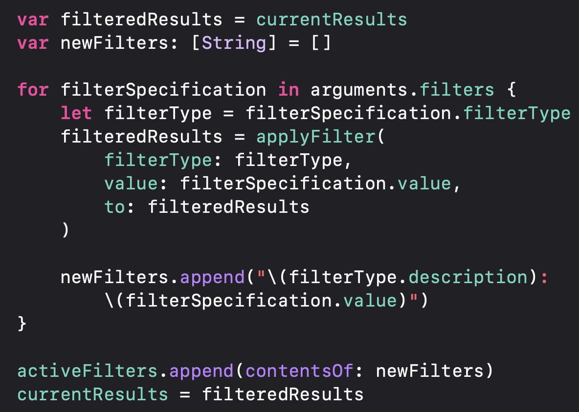 Next, we will iterate through each filter and add the new filters to the activeFilters