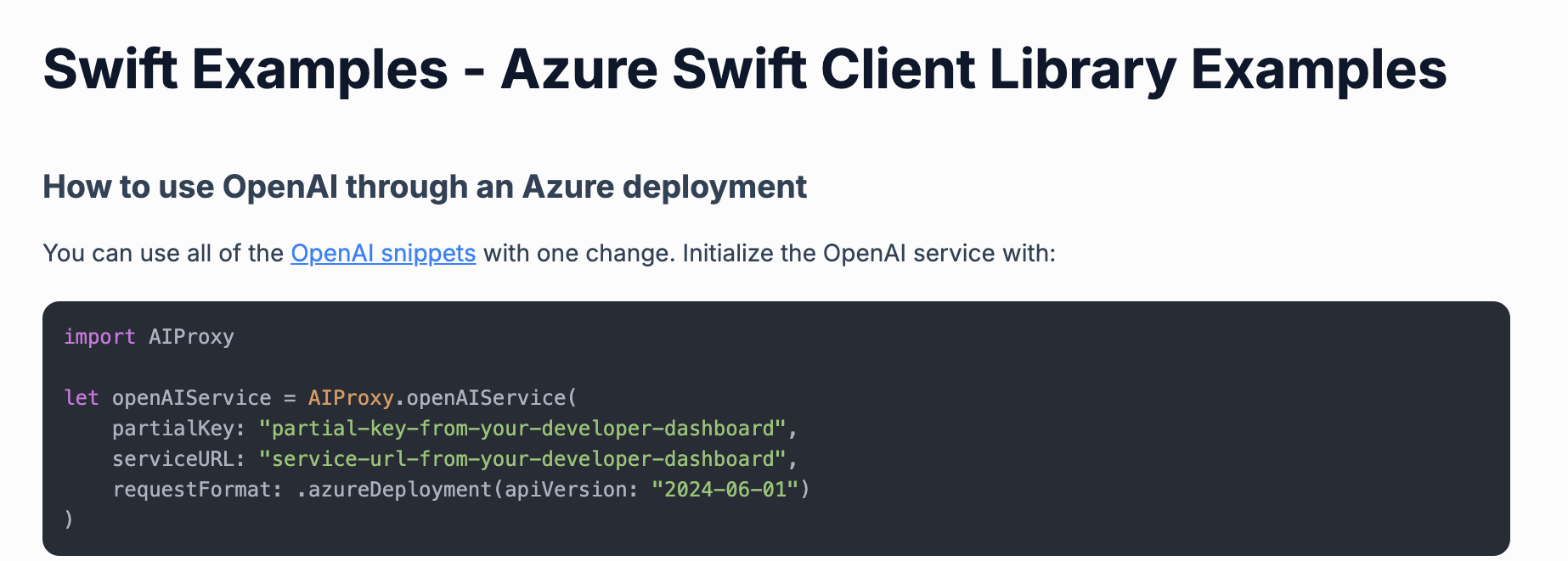 If you look at the AIProxy example for Azure, the Azure API follows the OpenAI service: