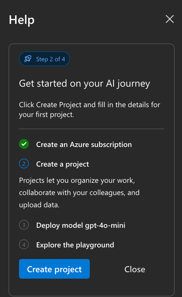 Once you sign up for an Azure subscription, you can go to the ai.azure.com to get started. Simply click on “Create a project” option: