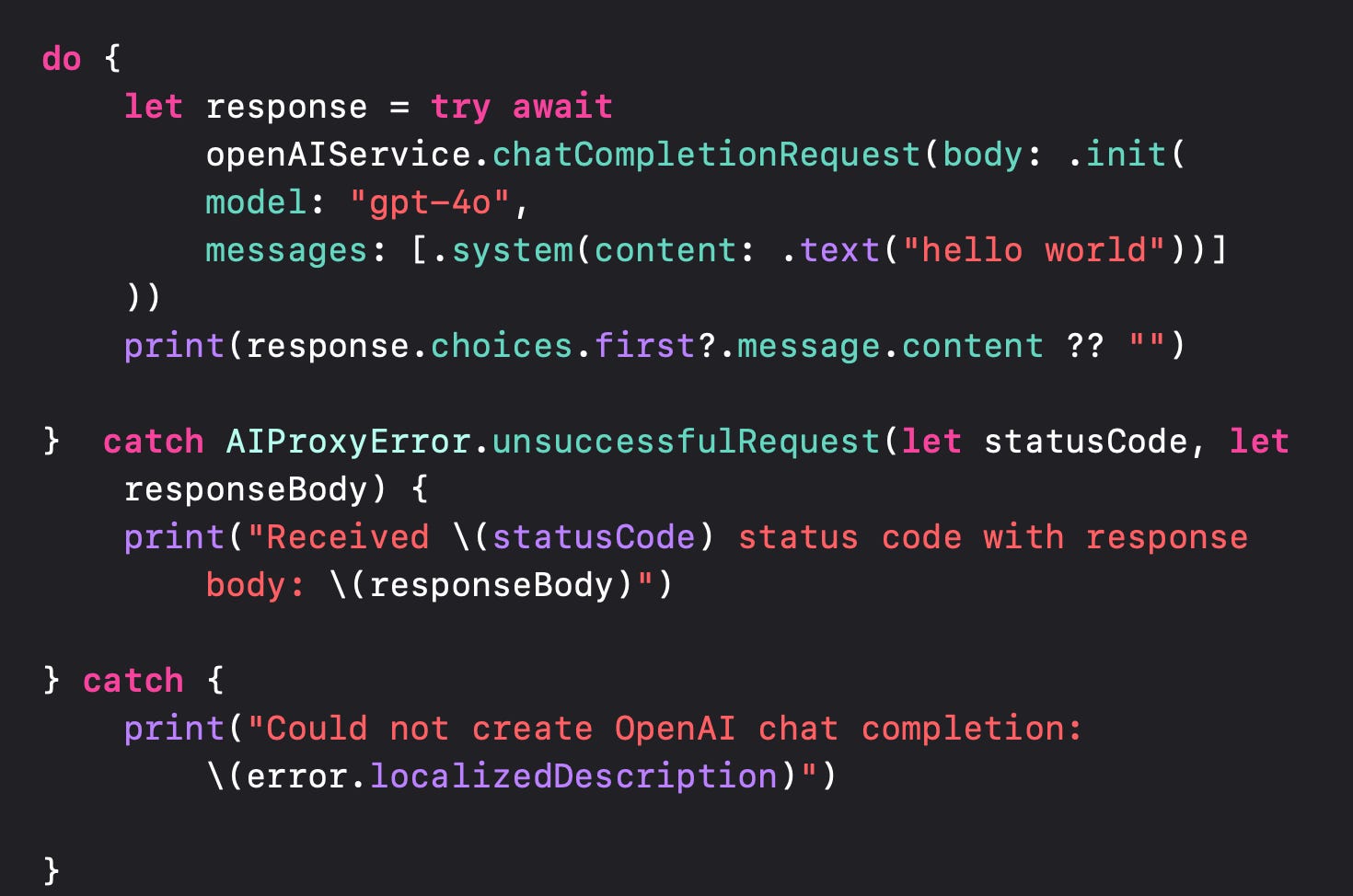 Now that the openAIService is initialized, it can be used via the AIProxySwift library following the OpenAI API protocol: