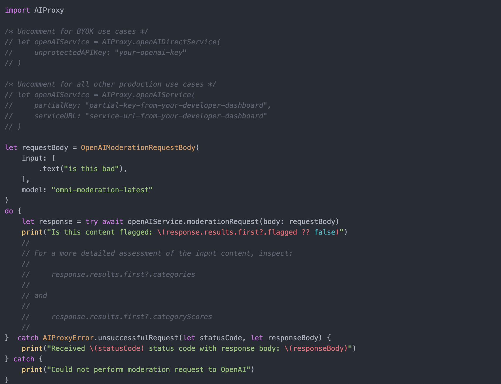 The API is simple - simply pass the user’s text or image input - you can do this via the Create Moderations endpoint or via the AIProxySwift library as follows: