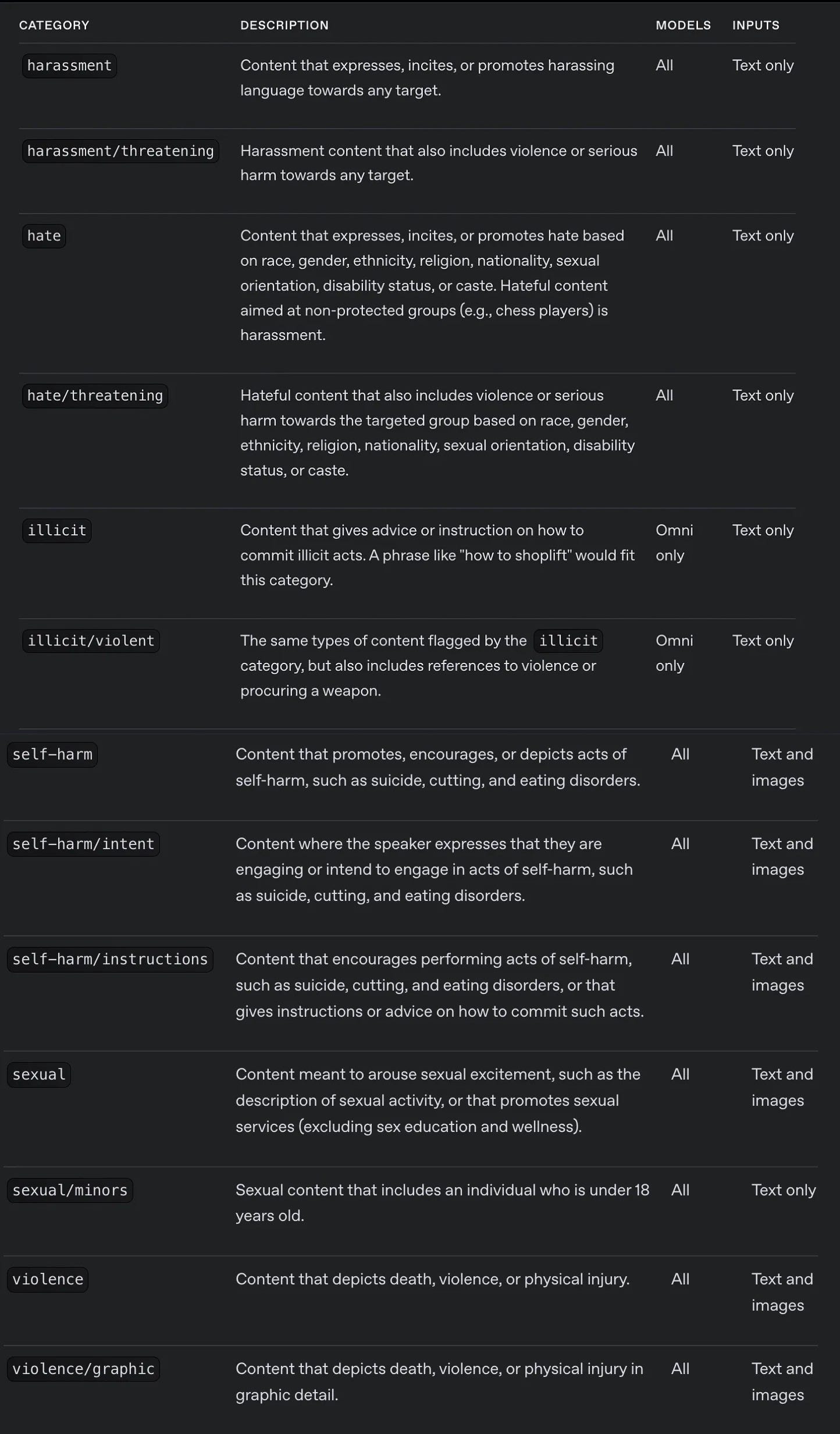 omni-moderation-latest: This model and all snapshots support more categorization options and multi-modal inputs.text-moderation-latest(Legacy): Older model that supports only text inputs and fewer input categorizations. The newer omni-moderation models will be the best choice for new applications.