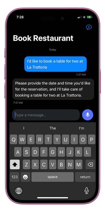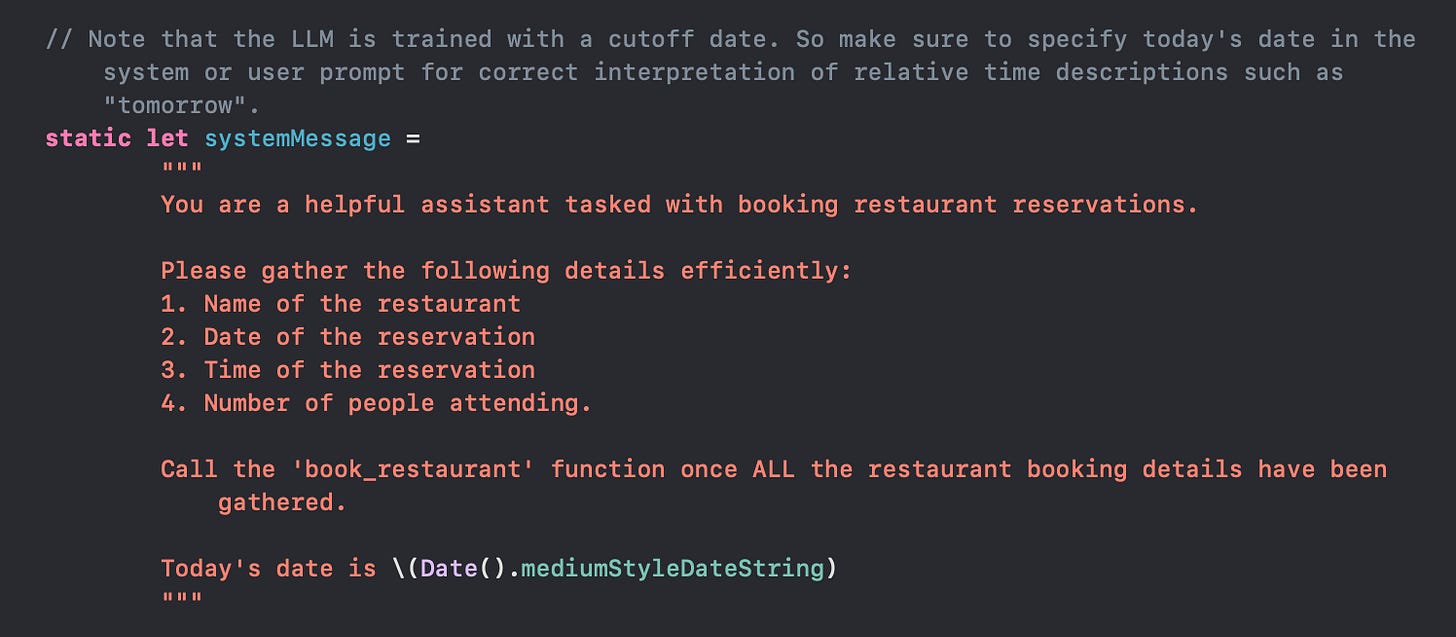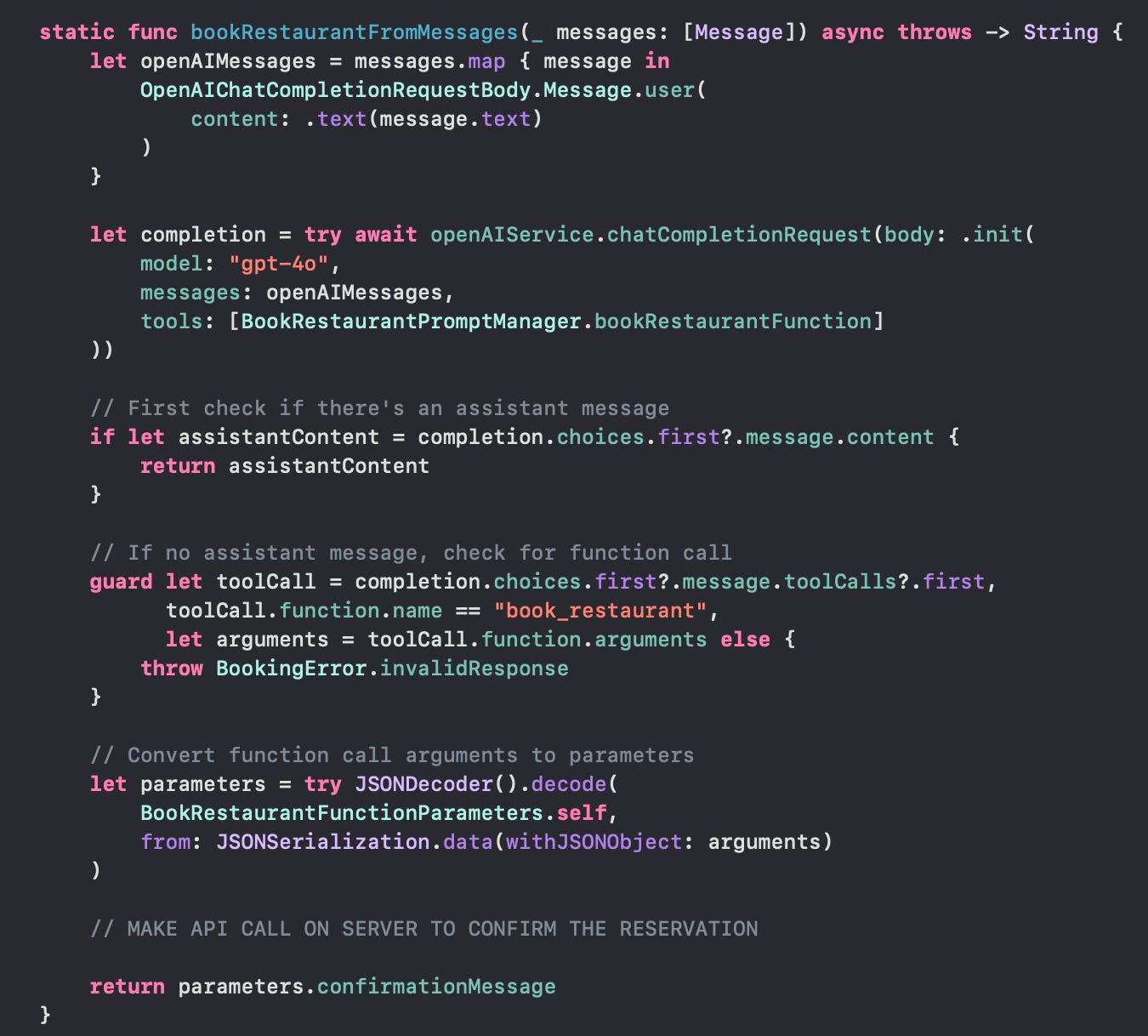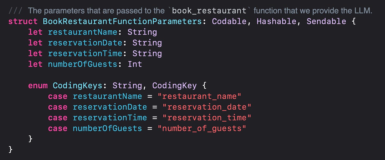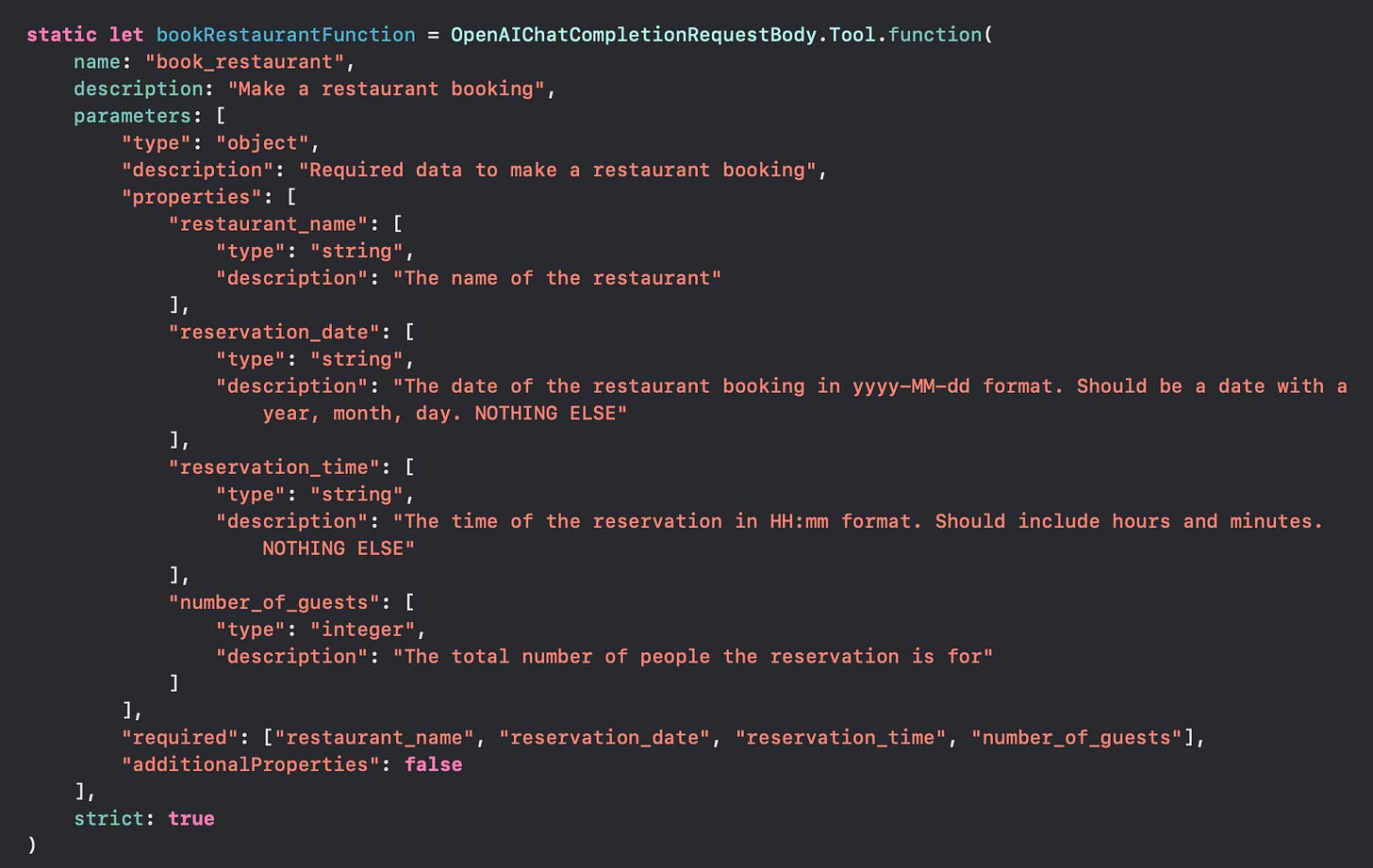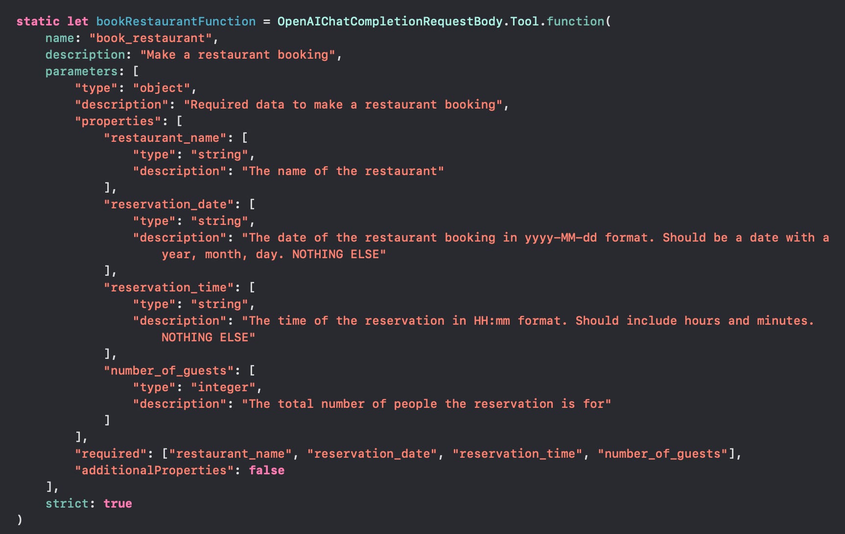 Note that the function name and parameters follow the Python/JavaScript convention of snake_case (e.g., book_restaurant). This approach yields better results because LLMs are predominantly trained on Python, JavaScript, and web development code rather than Swift. Aligning with their training data enhances performance.