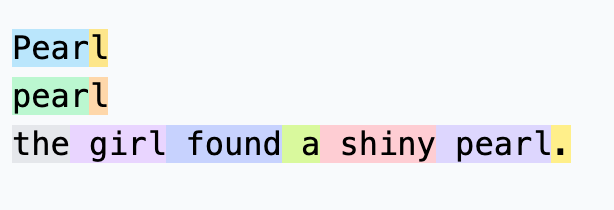 In addition, when the same word is placed in the end of a sentence, (using the space + word), it might be split differently in terms of Tokens. For example, the word “Pearl” / “pearl” is 2 tokens in the front of a sentence, but 1 token when at the end of a sentence: