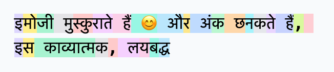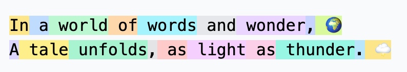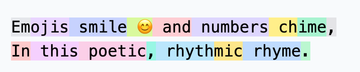 As mentioned above, tokens are the most likely letters that are often together optimized for the encoding / decoding function of the Tokenizer. In many cases, especially in English, this maps to words, but in many cases, it does not. For example, the words “Emojis”, “chime”, “rhythmic” are each 2 different tokens in the below sentence: