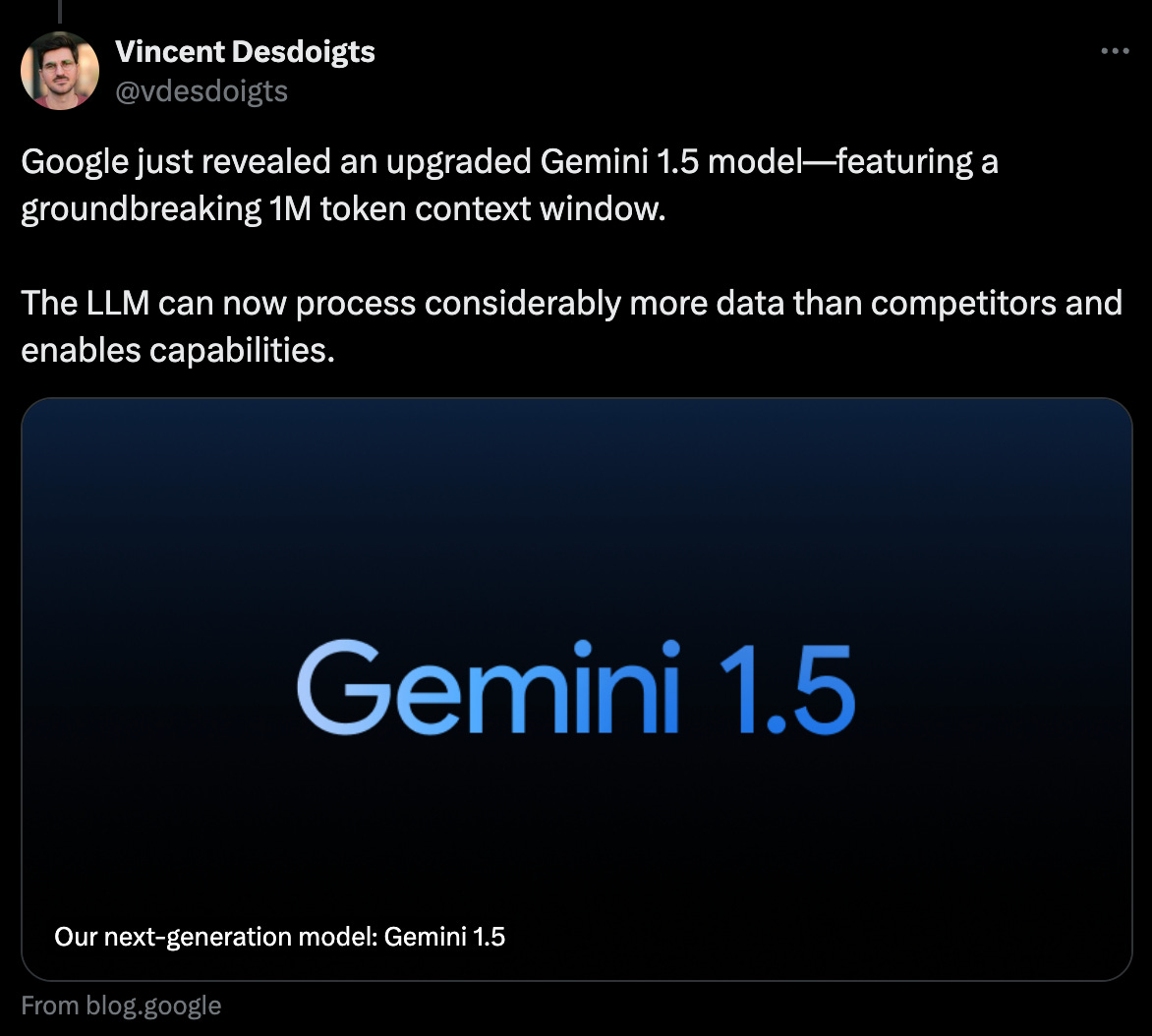 As you might have seen in the tweet posted in the beginning of this post, Google announced that their next generation Gemeni model will have a context window of up to 1 million tokens!