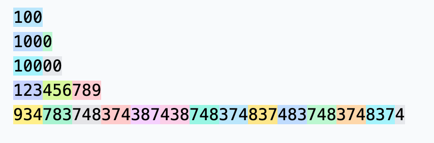 Just like with words, numbers are also split into numbers that occur next to each other most often. That means that the way numbers are managed is not as a full number, but a sequence of several numbers. For example: