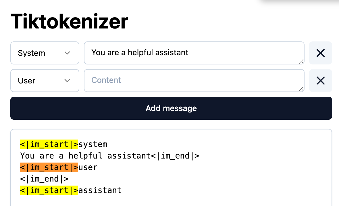 If you check the Vercel Tokenizer, you will notice that the ChatGPT-type user / assistant model actually has a few special tokens encoded that we do not explicitly see as a user: